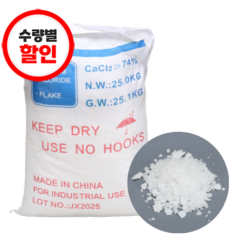 ★ 여러 브랜드 제품중 랜덤하게 출고 됩니다 ★ ★ 첨부된 이미지와 실제품이 상이 할 수 있으나, ★ 출고되는 제품 모두 동일 품질의 순도 74% 제품임을 안내드립니다. *제품특징 -용해열이 높아 동결방지 작용과 융빙효과를 발휘합니다. -겨울철 필수아이템 중국산 보급형 염화칼슘! -살포 후 효과가 빠릅니다. -비교적 낮은 온도에서도 효과가 있습니다.(영하 15도~30도까지 사용가능) -가늘고 눈처럼 생긴 조각상태로 모래와 혼합사용 시 비산이 적습니다. -겨울엔 제설용, 여름철엔 제습용 *제품용도 -겨울철 제설용 -폐수처리용, 강화제, 방진제 -여름철 제습용, 빙결 방지제 등 -조반 안정용 -비산먼지 억제용 -화학제품 제조공정용 -제습제 리필용 *주의사항 -사용후 남은 제품은 확실히 밀봉하여 보관 하여 주십시오. -제품특성상 사용후 남은 제품은 빠른 시일내에 사용 하여 주십시오. -제설용 이외의 용도로 사용 하지 마시오. -표면이 미끄러운곳에 뿌릴시에는 미끄러짐에 주의 하시오. (에폭시, 대리석) -다른 제설제와 혼용 하지 마시오. -손으로 만지거나 묻었을 때 유해하지 않지만 깨끗하게 씻으시오.